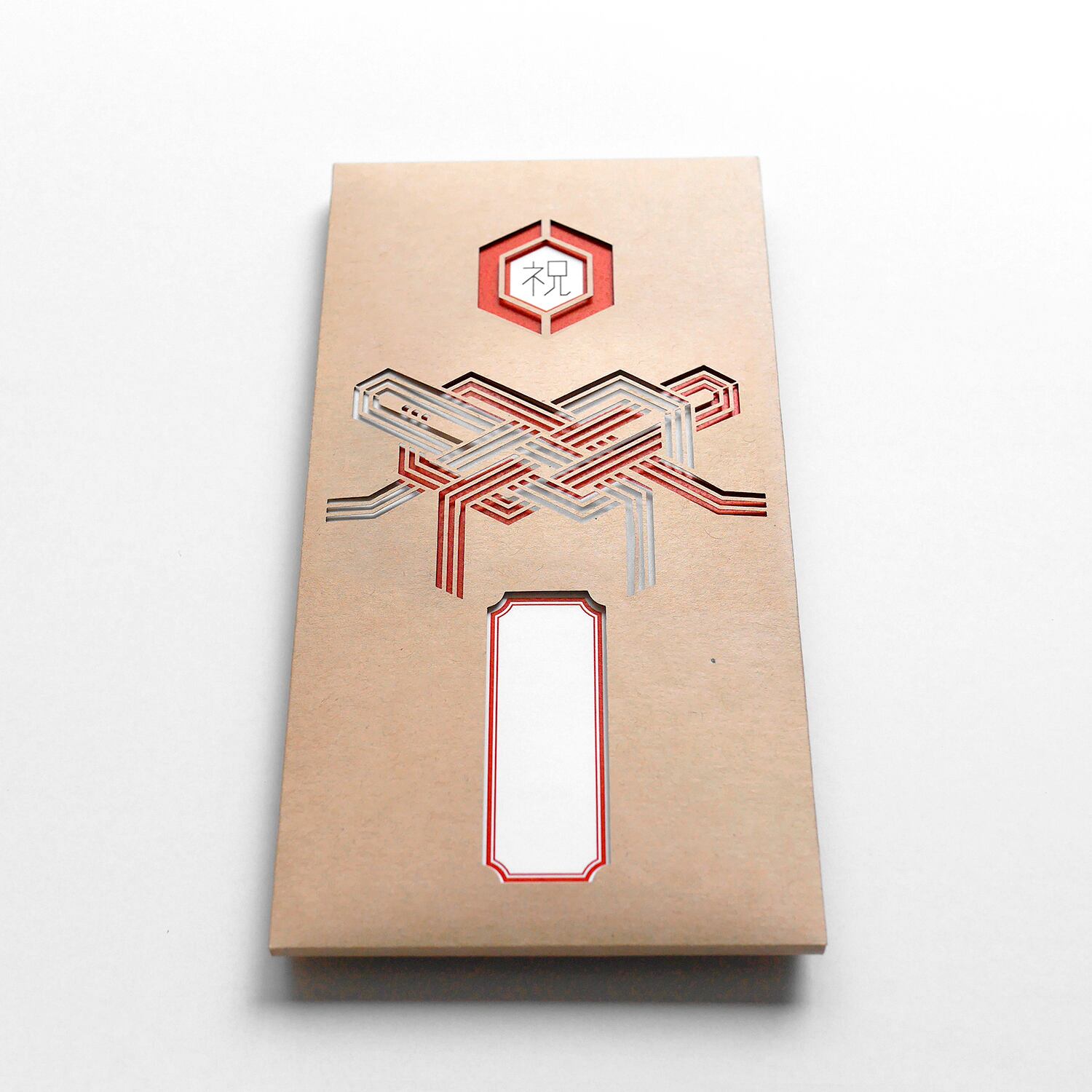 「花結び」は何度でもほどき、結び直す事ができるという事から何度あっても良い事に用いられる御祝儀袋です。その「花結び」をモチーフにした抜き絵でモダンにデザインしました。