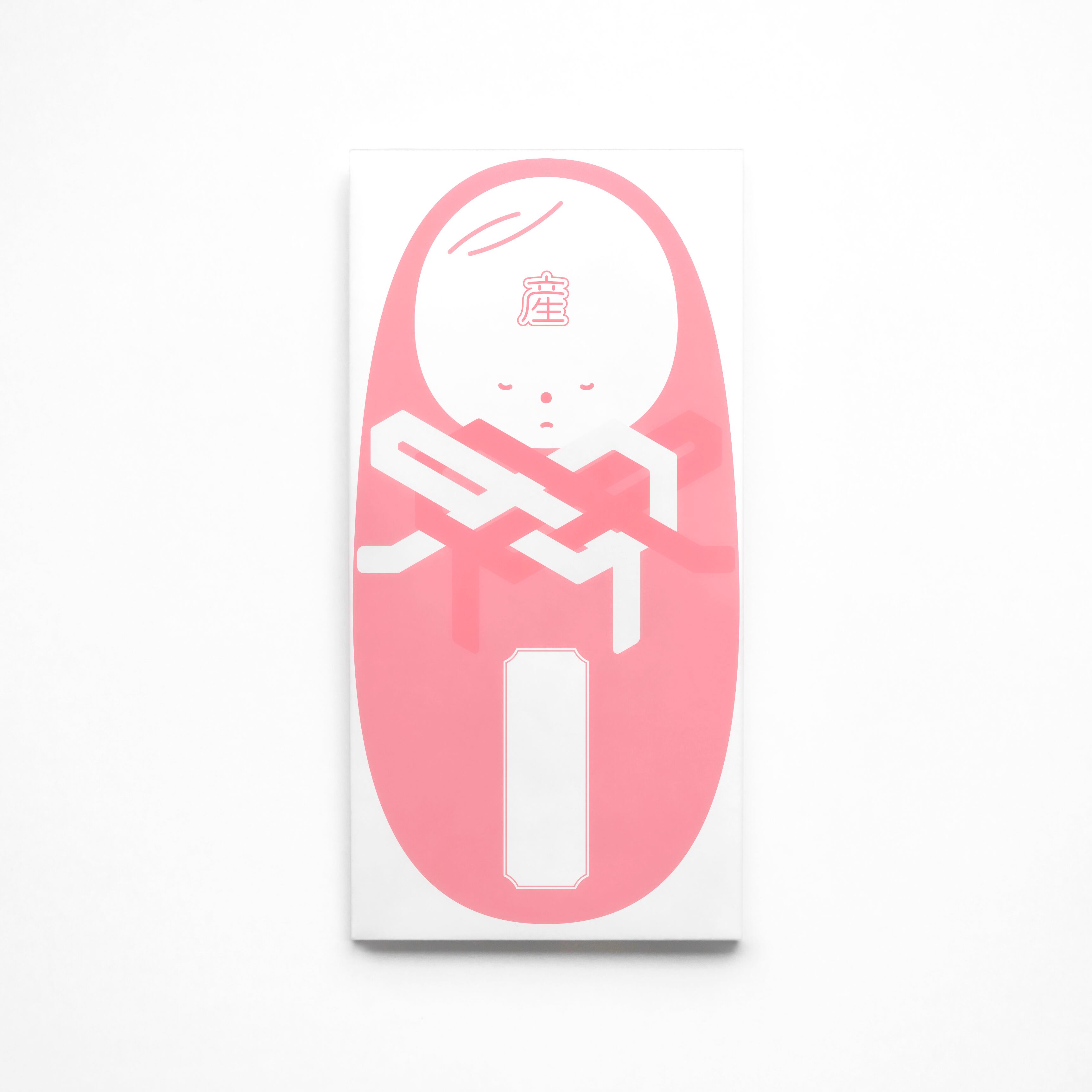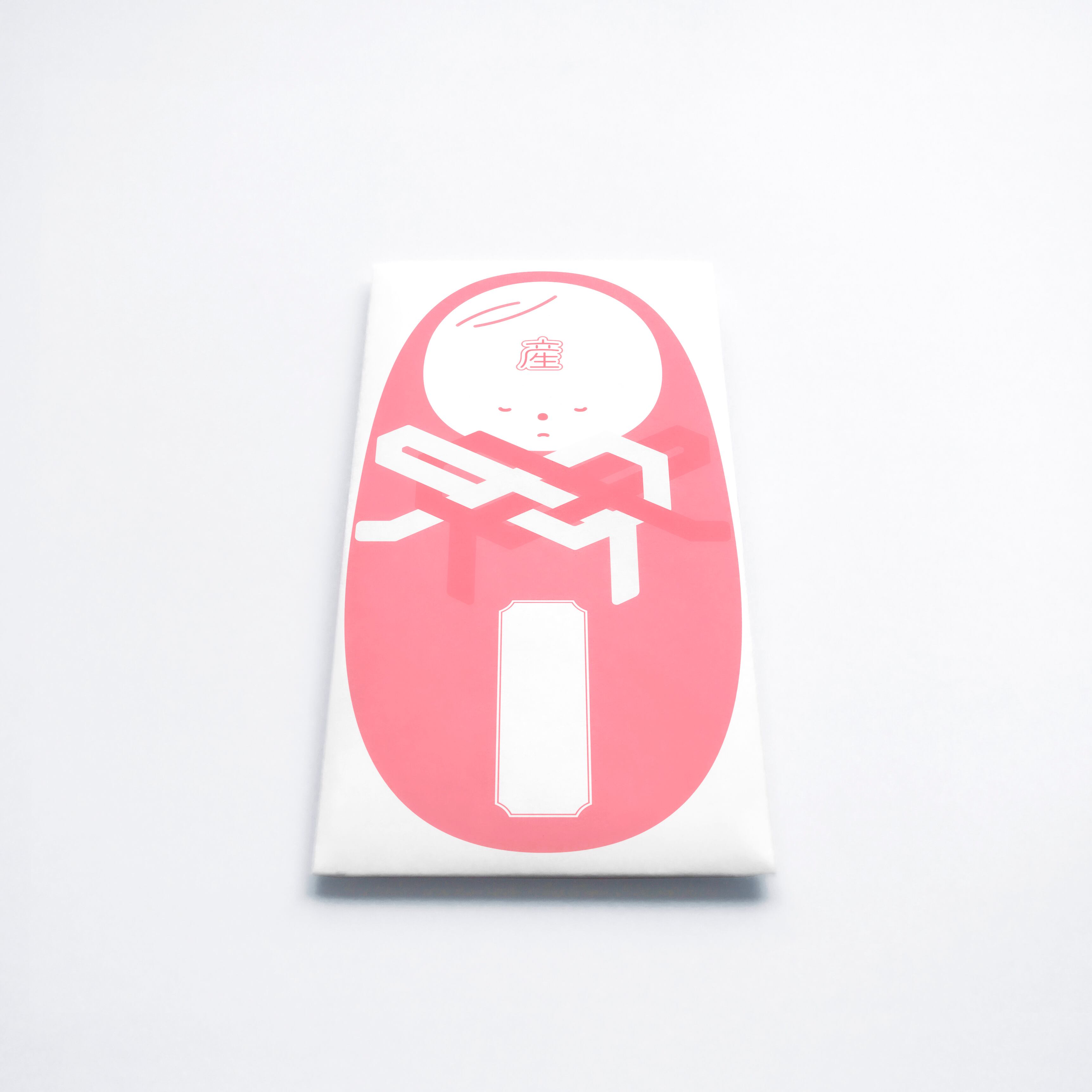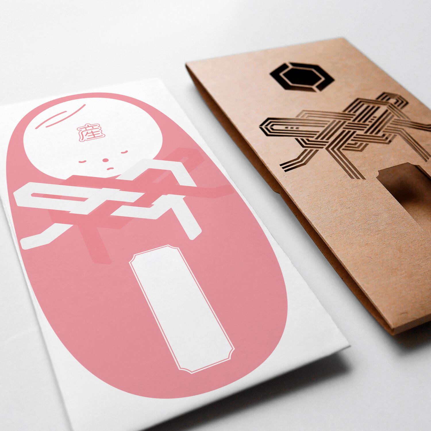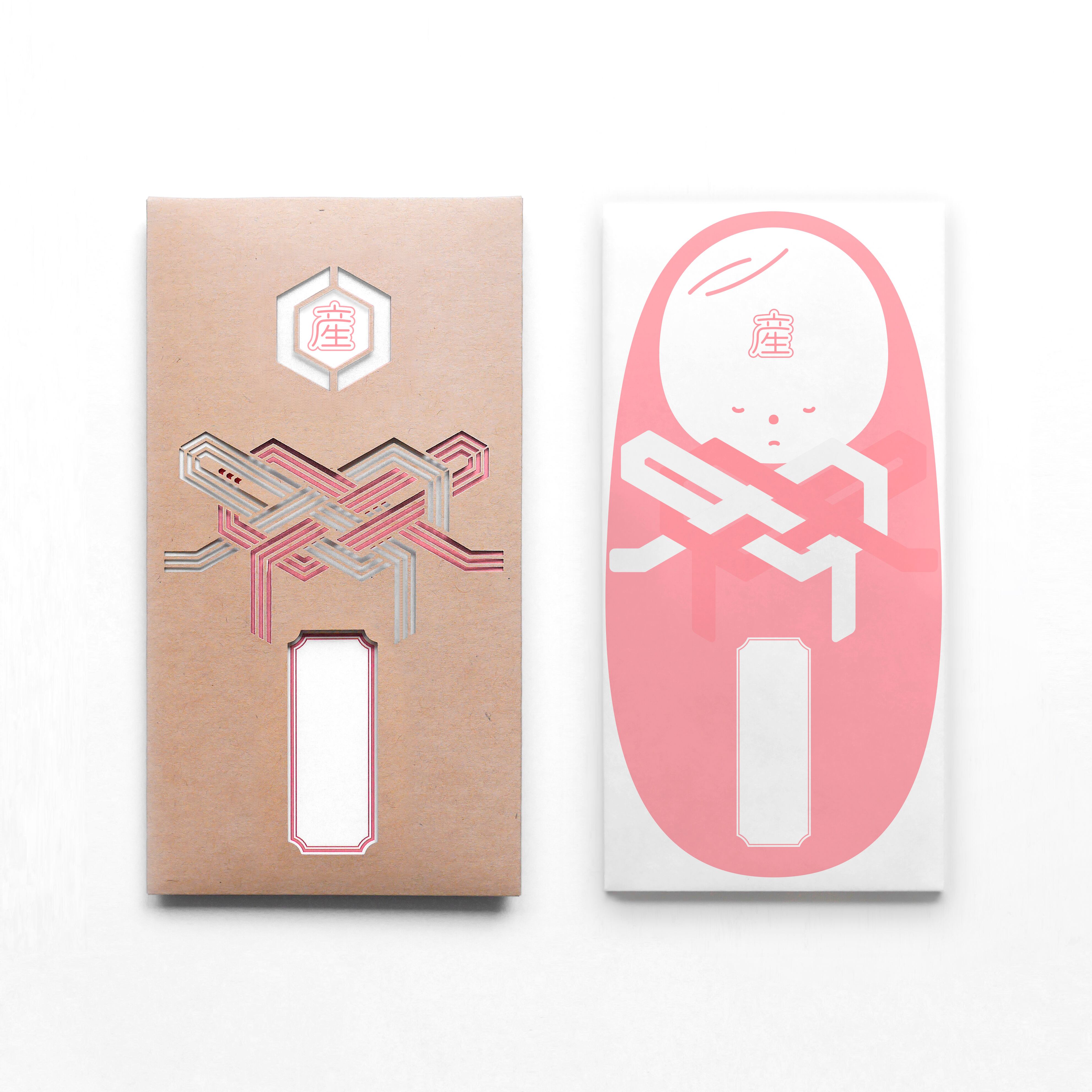 「花結び」は、ほどいて何度でも結び直すことができることから、出産祝いや入学祝いなど「繰り返しの慶事」に用いられる結び方です。その「花結び」をモチーフにした抜き絵で、モダンにデザインしました。中包には、花結びの中に可愛らしい赤ちゃんをあしらい、封を開けたときに思わず笑顔になるような“遊び心”を添えています。