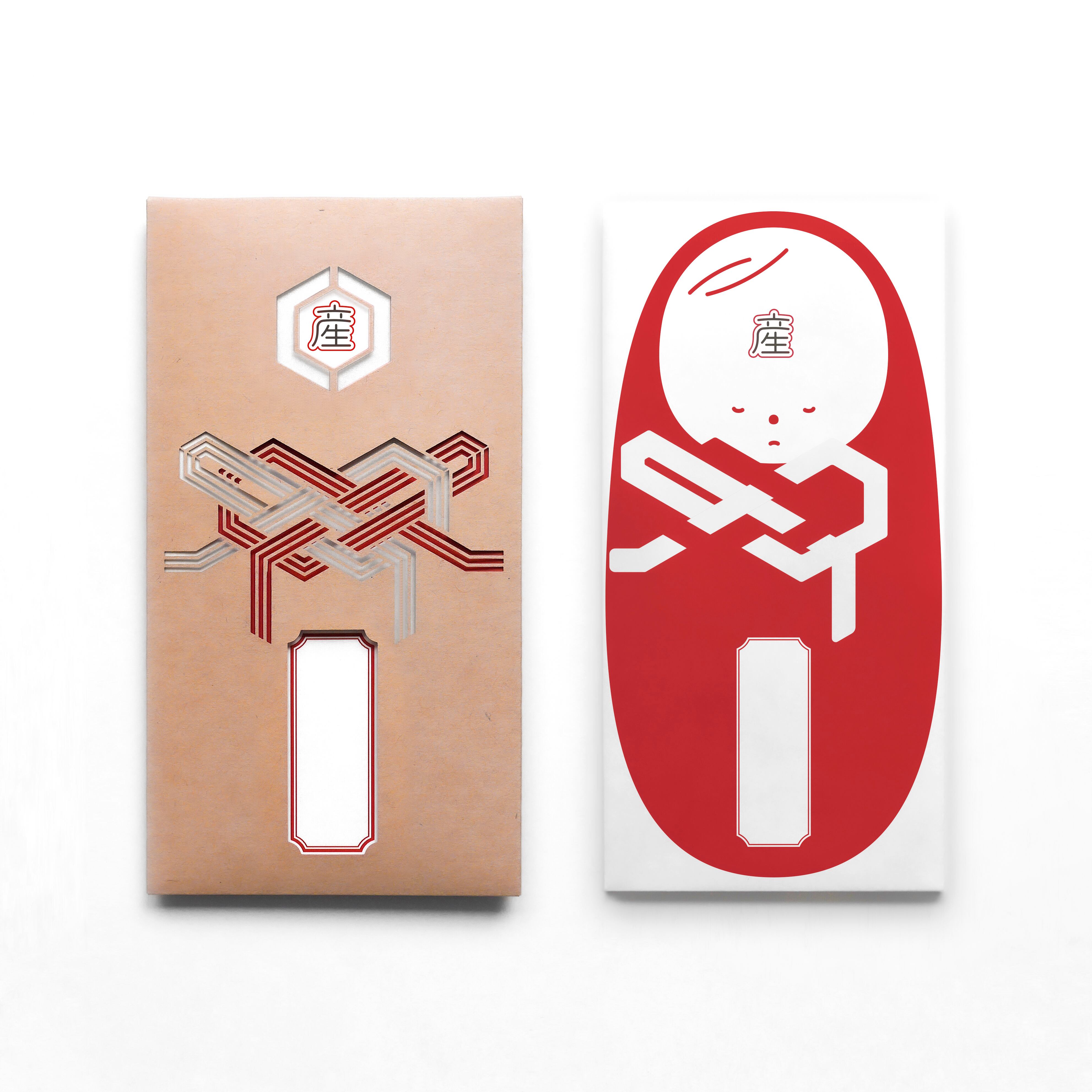「花結び」は、ほどいて何度でも結び直すことができることから、出産祝いや入学祝いなど「繰り返しの慶事」に用いられる結び方です。その「花結び」をモチーフにした抜き絵で、モダンにデザインしました。中包には、花結びの中に可愛らしい赤ちゃんをあしらい、封を開けたときに思わず笑顔になるような“遊び心”を添えています。