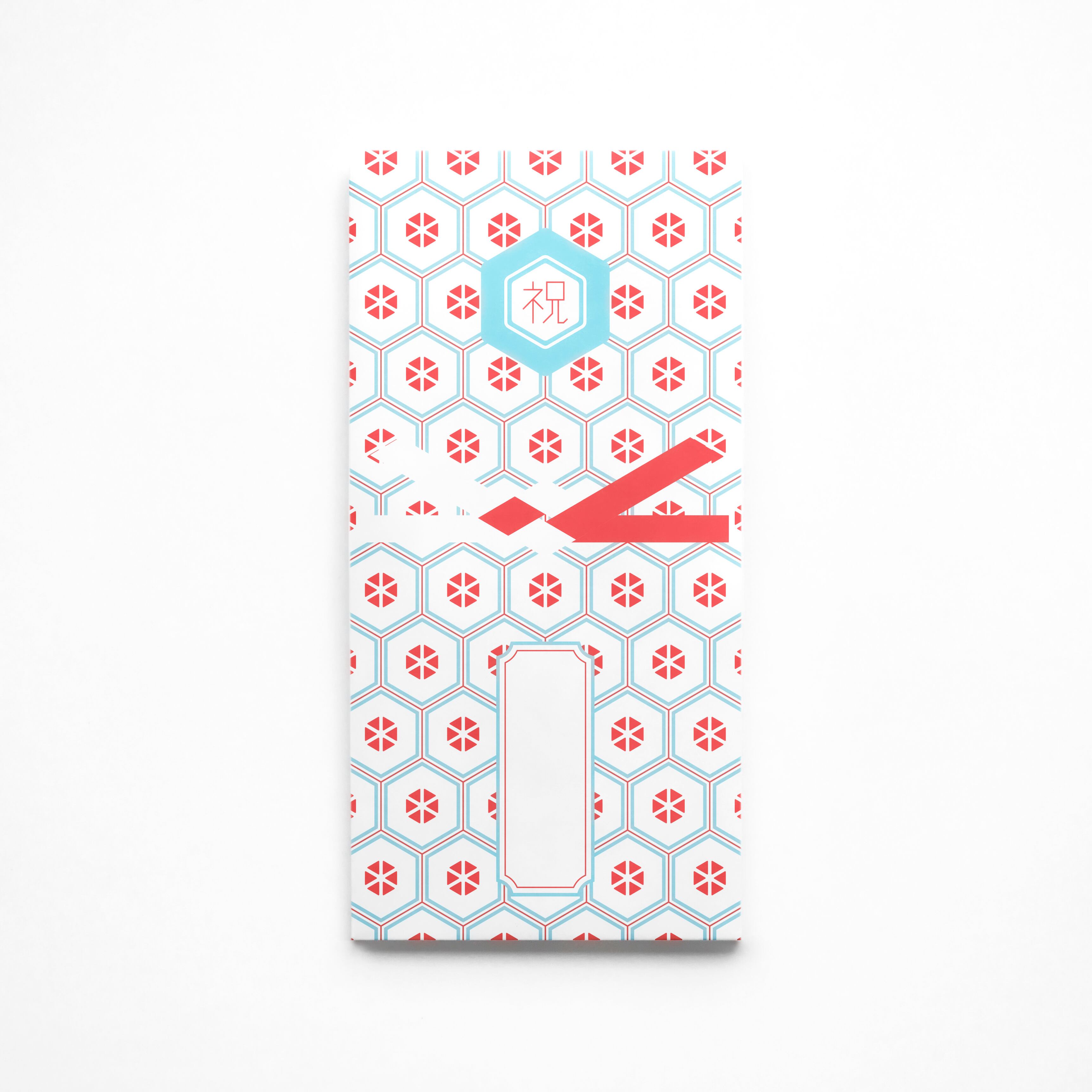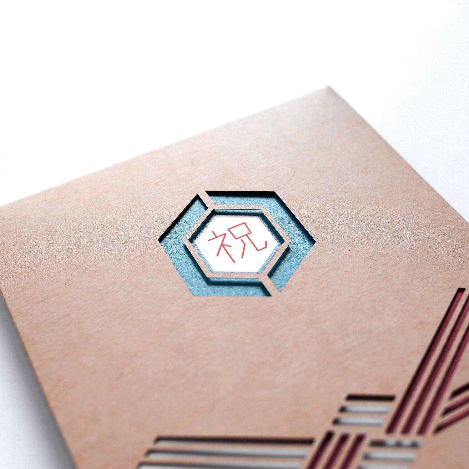 「結び切り」は、一度結ぶとほどけないことから「繰り返してほしくない、一度きりで良いお祝い」に用いられる結び方です。その「結び切り」をモチーフにした抜き絵で、モダンにデザインしました。中包には、長寿や繁栄を願う亀甲柄に華やかな花をあしらった「花亀甲」を配し、晴れやかなお祝いの気持ちを込めています。